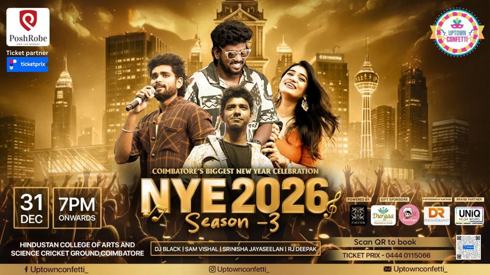 Coimbatore is all set to welcome the New Year in grand style with NYE 2026 – Season 3, one of the city’s most anticipated year-end celebrations. Known for its electrifying atmosphere, star-studded performances, and massive crowd energy, this event promises an unforgettable night as the clock strikes midnight.